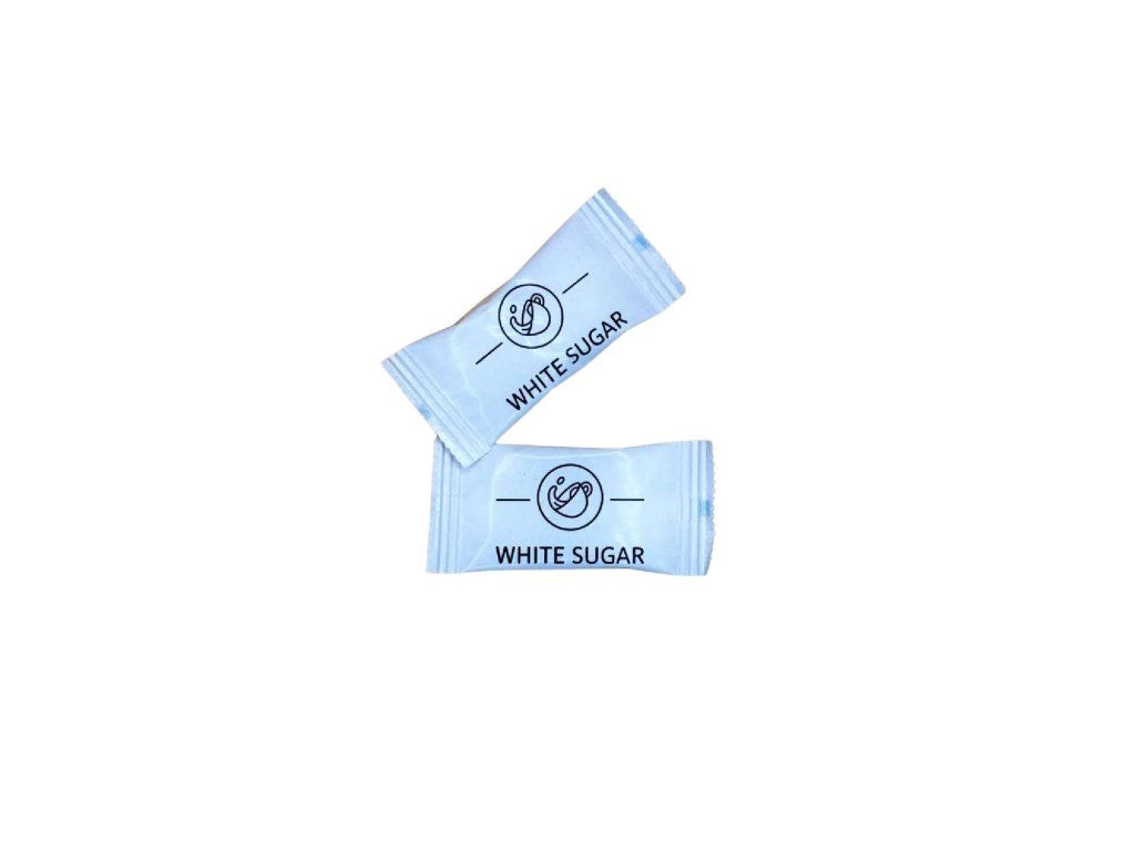 HB biely cukor 4 kgPorciovaný biely cukor v bielych vankúšikoch s potlačou.
