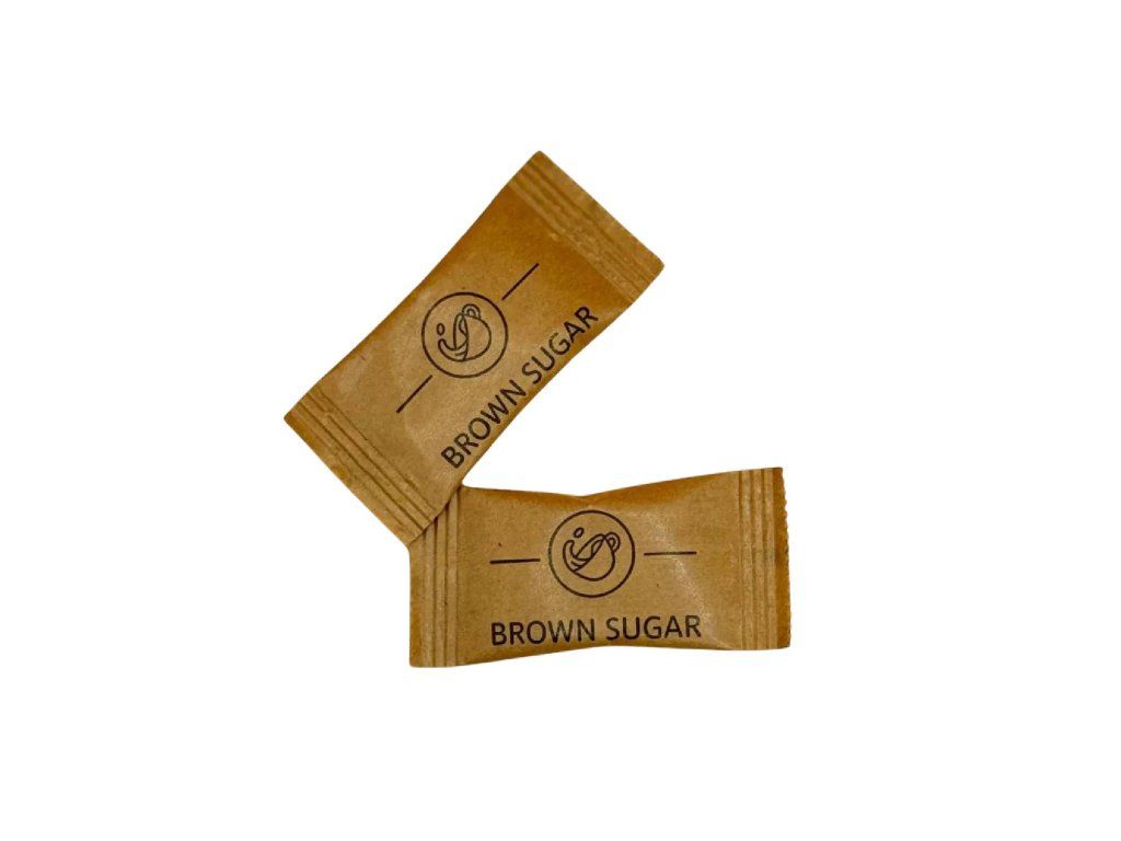 HB trstinový cukor 4 kgPorciovaný trstinový cukor v hnedých vankúšikoch s potlačou.
