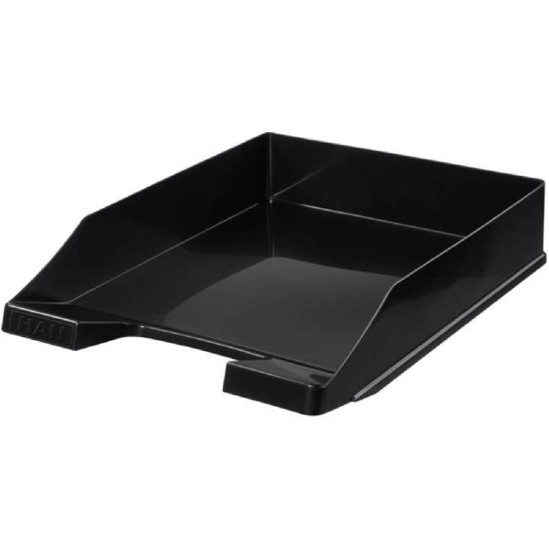 Stohovateľný odkladač formátu A4 z nepriehľadného čierneho plastu. Zadné zarážky umožňujú odkladače stohovať aj stupňovito dozadu.