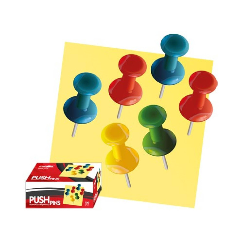 Pripínáčky nástenkové – poniklované farebné pripináčky do korkových tabúľ s farebnou hlavičkou v tvare vežičky o priemere 7 mm a nožičkou dlhou 12 mm.
