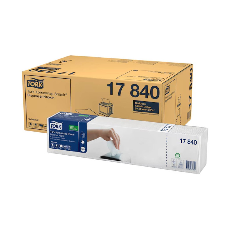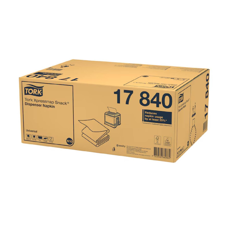 Tork Xpressnap Snack® Universal servítky boli navrhnuté pre samoobslužné reštaurácie, kde stačia aj malé servítky. Systém vám pomôže znížiť mieru používania servítok minimálne o 25 % v porovnaní s tradičnými zásobníkmi na servítky. Tork Xpressnap Snack® biele 1-vrstvové servítky do zásobníka sú ideálne pre zariadenia, ktorým záleží na pohodlí a nákladoch a podávajú občerstvenie, nápoje alebo malé porcie jedál.