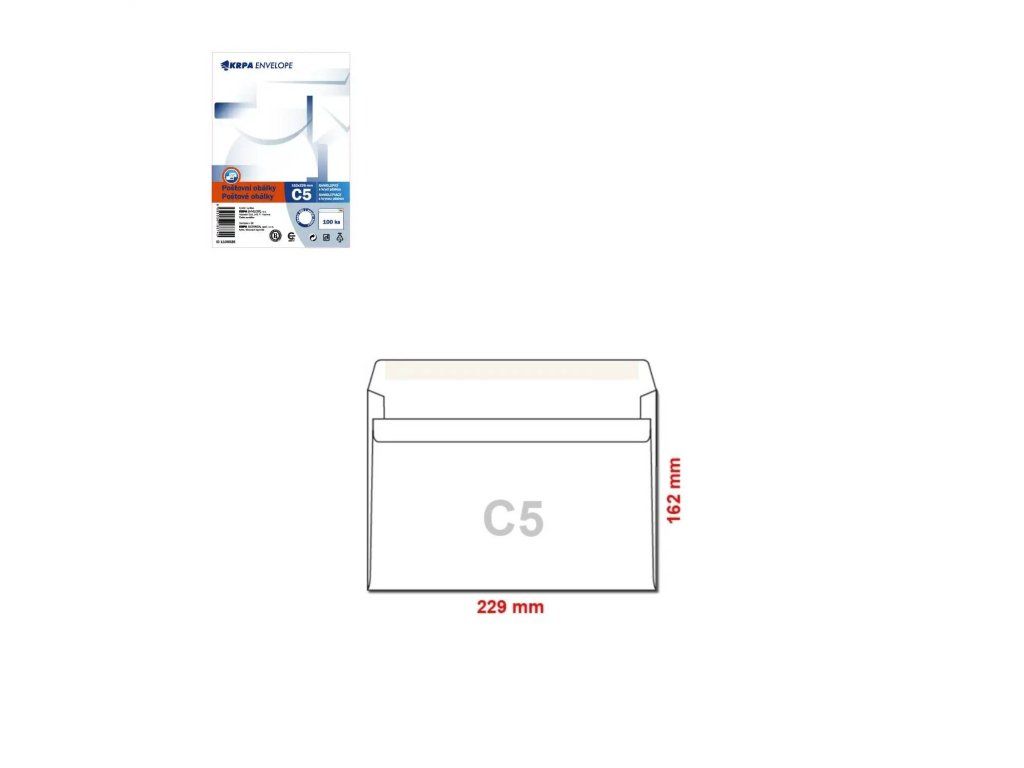 <p style="margin:0cm 0cm 8pt"><span style="font-size:12pt"><span style="line-height:115%"><span style="font-family:Aptos,sans-serif"><b><span style="font-family:"Arial",sans-serif">Obálky C5 samolepiace - 100 ks</span></b></span></span></span></p>\r\n\r\n<p style="margin:0cm 0cm 8pt"><span style="font-size:12pt"><span style="line-height:115%"><span style="font-family:Aptos,sans-serif"><span style="font-family:"Arial",sans-serif">Farba: biela</span></span></span></span></p>\r\n\r\n<p style="margin:0cm 0cm 8pt"><span style="font-size:12pt"><span style="line-height:115%"><span style="font-family:Aptos,sans-serif"><span style="font-family:"Arial",sans-serif">Balenie: 100 ks</span></span></span></span></p>\r\n\r\n<p style="margin:0cm 0cm 8pt"><span style="font-size:12pt"><span style="line-height:115%"><span style="font-family:Aptos,sans-serif"><span style="font-family:"Arial",sans-serif">Rozmery: 162 x 229 mm</span></span></span></span></p>\r\n\r\n<p style="margin:0cm 0cm 8pt"><span style="font-size:12pt"><span style="line-height:115%"><span style="font-family:Aptos,sans-serif"><span style="font-family:"Arial",sans-serif">Formát: C5</span></span></span></span></p>\r\n\r\n<p style="margin:0cm 0cm 8pt"><span style="font-size:12pt"><span style="line-height:115%"><span style="font-family:Aptos,sans-serif"><span style="font-family:"Arial",sans-serif">Lepenie: samolepiace</span></span></span></span></p>\r\n\r\n<p style="margin:0cm 0cm 8pt"><span style="font-size:12pt"><span style="line-height:115%"><span style="font-family:Aptos,sans-serif"><span style="font-family:"Arial",sans-serif">Druh papiera: bezdrevný</span></span></span></span></p>\r\n\r\n<p style="margin:0cm 0cm 8pt"><span style="font-size:12pt"><span style="line-height:115%"><span style="font-family:Aptos,sans-serif"><span style="font-family:"Arial",sans-serif">Potlač: bez potlače</span></span></span></span></p>\r\n\r\n<p style="margin:0cm 0cm 8pt"><span style="font-size:12pt"><span style="line-height:115%"><span style="font-family:Aptos,sans-serif"><span style="font-family:"Arial",sans-serif">Cena je za bal./100 ks</span></span></span></span></p>\r\n\r\n<p style="margin:0cm 0cm 8pt"><span style="font-size:12pt"><span style="line-height:115%"><span style="font-family:Aptos,sans-serif"><span style="font-family:"Arial",sans-serif"></span></span></span></span></p>\r\n\r\n<p style="margin:0cm 0cm 8pt"><span style="font-size:12pt"><span style="line-height:115%"><span style="font-family:Aptos,sans-serif"></span></span></span></p>\r\nDodatočné parametre