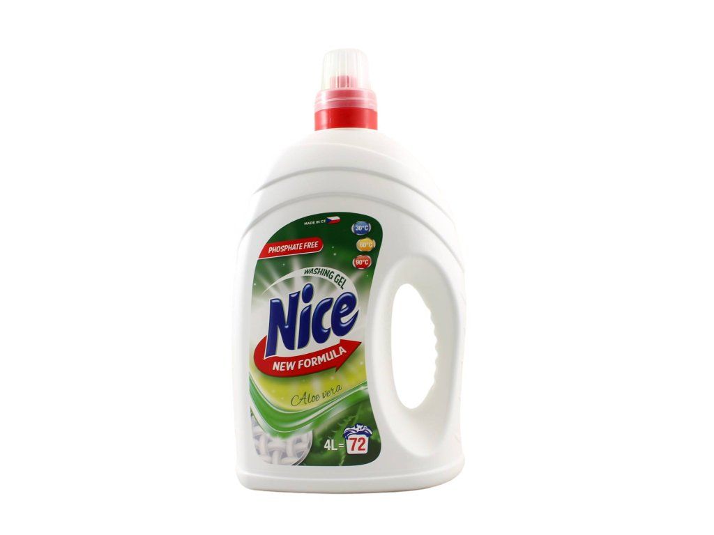 Prací gel NICE ALOE VERA 4LUniverzálny prací gel vhodný na pranie pri teplotách od 30°C do 90°C všetkých druhov bielizne okrem vlny a hodvábu. Šetrne vyperie bielizeň, spoľahlivo odstráni špinu a zanechá príjemnú aloe vera vôňu. Prací gel je vhodný pre všetky druhy práčok aj na ručné pranie. 4L - 72 pracích dávok. Neobsahuje fosfáty.