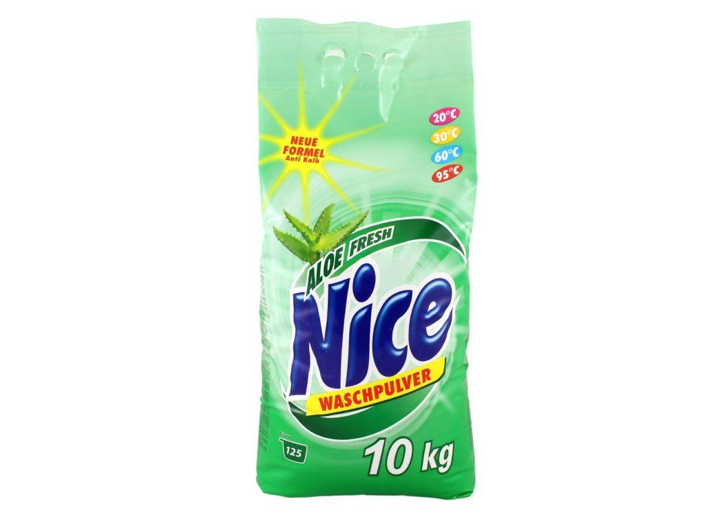 Prací prášok NICE ALOE FRESH 10 kgUniverzálny prací prostriedok vhodný na pranie pri teplotách od 20°C do 95°C všetkých druhov bielizne okrem vlny a hodvábu. Šetrne vyperie bielizeň, spoľahlivo odstráni špinu a zanechá príjemnú aloe vera vôňu. Prací prášok je vhodný pre všetky druhy práčok aj ručné pranie. 10kg - 125 pracích dávok. Neobsahuje fosfáty.