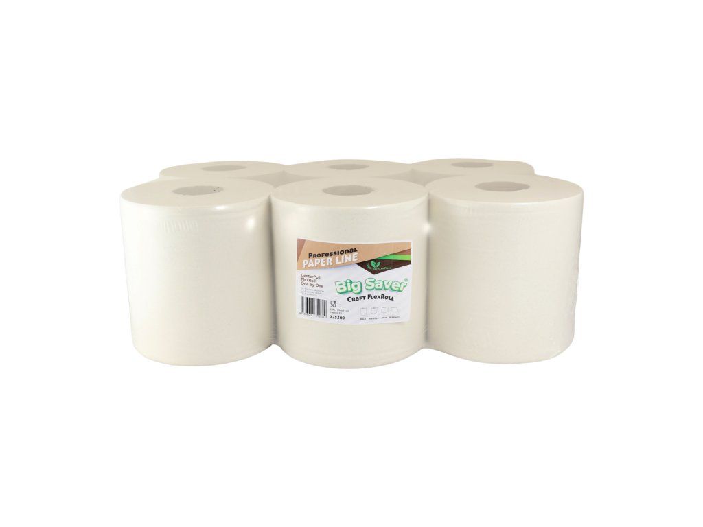 225300 – Utierka BIGSAVER Craft FlexRoll 300m (6ks)Papierová utierka FlexRoll je vyrobená zo 100% kvalitného recyklovaného papiera, belosť 80%. Jedna vrstva savého recyklovaného papiera robí utierku veľmi účinnou. Utierka funguje oveľa lepšie ako viacvrstvové utierky, ktoré obsahujú lepiacu vrstvu, ktorá znižuje nasiakavosť. Dlhý kotúč umožňuje výrazne znížiť frekvenciu výmeny utierok v zásobníku. Nízka prašnosť a vysoká mechanická pevnosť ovplyvňujú optimalizáciu spotreby utierok. Utierku je možné vnútorne odvíjať po vytiahnutí ľahko odnímateľného návleku a pri použití s príslušným dávkovačom je možné útržky dávkovať jednotlivo. Špeciálny typ perforácie listov, zaisťujúci možnosť ich ľahkého roztrhnutia, čím sa zabráni odobratiu ich veľkého množstva naraz.