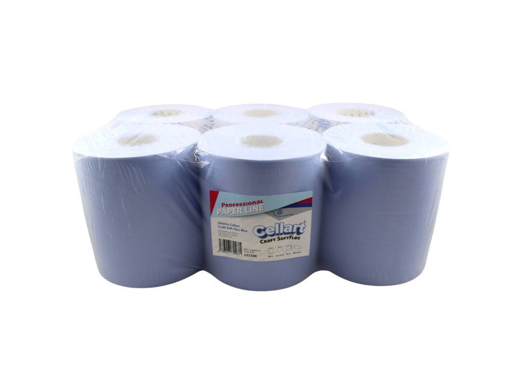 122300 – Utierka CELLART Craft Soft Flex Blue, 300m (6ks)Papierová utierka Soft Flex Blue je vyrobená z vysokokvalitnéj 100% celulózy modrej farby. Jedna vrstva mäkkého a na dotyk príjemného uteráka s vysokou gramážou ho robí veľmi savým a účinným. Utierka funguje oveľa lepšie v porovnaní s viacvrstvovými uterákmi, ktoré obsahujú lepiacu vrstvu, ktorá znižuje nasiakavosť a robí utierku tvrdou a môže nadmerne zaťažovať zásobník. Dlhý kotúč umožňuje výrazne znížiť frekvenciu výmeny utierok v zásobníku.Nízka prašnosť a vysoká mechanická pevnosť ovplyvňujú optimalizáciu spotreby utierok. Modrá farba umožňuje použiť utierku tam, kde sú potrebné farebné utierky.