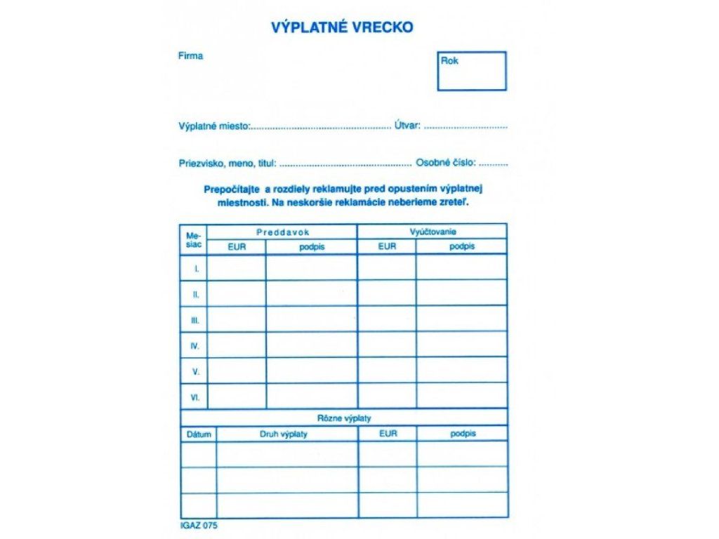 <p style="margin:0cm 0cm 8pt"><span style="font-size:11pt"><span style="line-height:107%"><span style="font-family:Calibri,sans-serif"><b><span style="font-size:12.0pt"><span style="line-height:107%"><span style="font-family:"Arial",sans-serif">Výplatné vrecko, C6</span></span></span></b></span></span></span></p>\r\n\r\n<p style="margin:0cm 0cm 8pt"><span style="font-size:11pt"><span style="line-height:107%"><span style="font-family:Calibri,sans-serif"><span style="font-size:12.0pt"><span style="line-height:107%"><span style="font-family:"Arial",sans-serif">Výplatné vrecko formátu C6 je určené na uloženie dokumentov alebo drobné doklady. Praktické riešenie na prehľadné a bezpečné uschovanie dokumentov.</span></span></span></span></span></span></p>\r\n\r\n<ul>\r\n <li style="margin:0cm 0cm 0cm 36pt"><span style="font-size:11pt"><span style="line-height:107%"><span style="font-family:Calibri,sans-serif"><span style="font-size:12.0pt"><span style="line-height:107%"></span></span><span style="font-size:12.0pt"><span style="line-height:107%"><span style="font-family:"Arial",sans-serif">Formát: C6</span></span></span></span></span></span></li>\r\n <li style="margin:0cm 0cm 0cm 36pt"><span style="font-size:11pt"><span style="line-height:107%"><span style="font-family:Calibri,sans-serif"><span style="font-size:12.0pt"><span style="line-height:107%"></span></span><span style="font-size:12.0pt"><span style="line-height:107%"><span style="font-family:"Arial",sans-serif">Určené pre dokumenty: A6</span></span></span></span></span></span></li>\r\n <li style="margin:0cm 0cm 0cm 36pt"><span style="font-size:11pt"><span style="line-height:107%"><span style="font-family:Calibri,sans-serif"><span style="font-size:12.0pt"><span style="line-height:107%"></span></span><span style="font-size:12.0pt"><span style="line-height:107%"><span style="font-family:"Arial",sans-serif">Použitie: výplatné pásky, malé doklady</span></span></span></span></span></span></li>\r\n <li style="margin:0cm 0cm 8pt 36pt"><span style="font-size:11pt"><span style="line-height:107%"><span style="font-family:Calibri,sans-serif"><span style="font-size:12.0pt"><span style="line-height:107%"></span></span><span style="font-size:12.0pt"><span style="line-height:107%"><span style="font-family:"Arial",sans-serif">Cena je za balenie 1 ks</span></span></span></span></span></span></li>\r\n</ul>\r\nDodatočné parametre